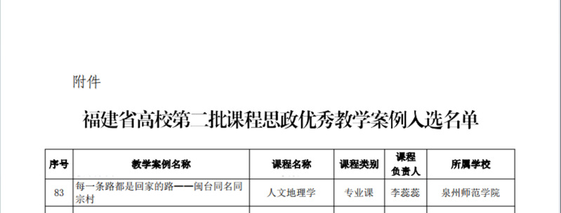 近期公布的福建省第二批课程思政优秀教学案例评选结果,我院李蕊蕊副教授主讲的《人文地理学》案例获批高校课程思政教学优秀案例。