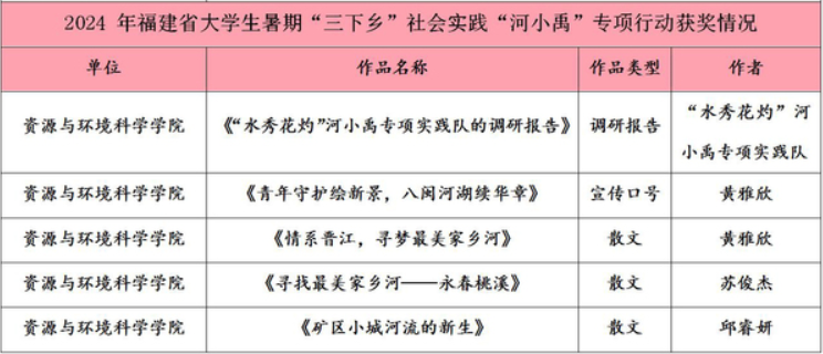 近期,共青团福建省委公布了2024年福建省大学生署期文化科技卫生“三下乡”社会实践系列活动评选结果,在“河小禹”专项行动评选中,我院喜获5项表彰:优秀调研报告1项,优秀宣传口号1条,优秀散文作品3篇。